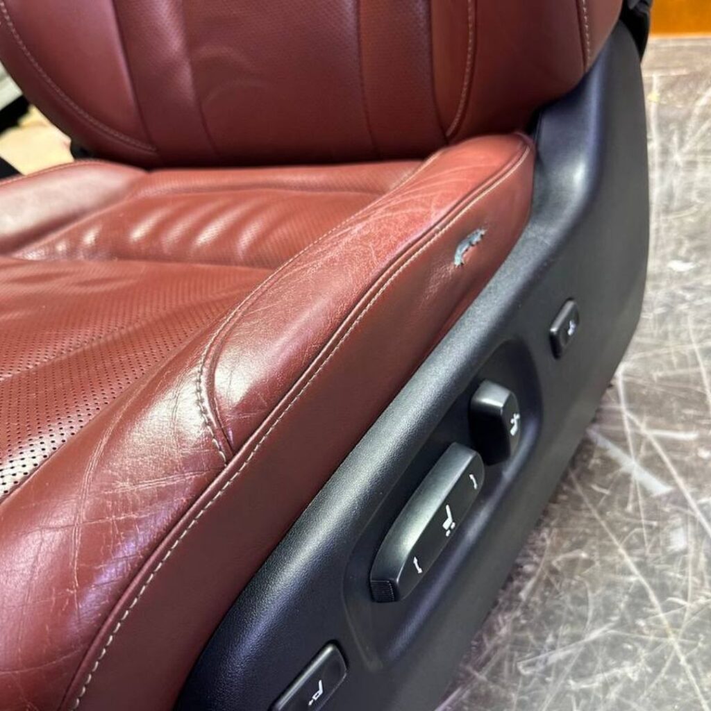 На фото — пример нашей работы: изношенная боковая часть сиденья восстановлена и перешита в заводском цвете. После ремонта кожа выглядит как новая, без следов износа и трещин. Мы подбираем материал точно по оттенку и текстуре, чтобы сохранить оригинальный стиль салона.